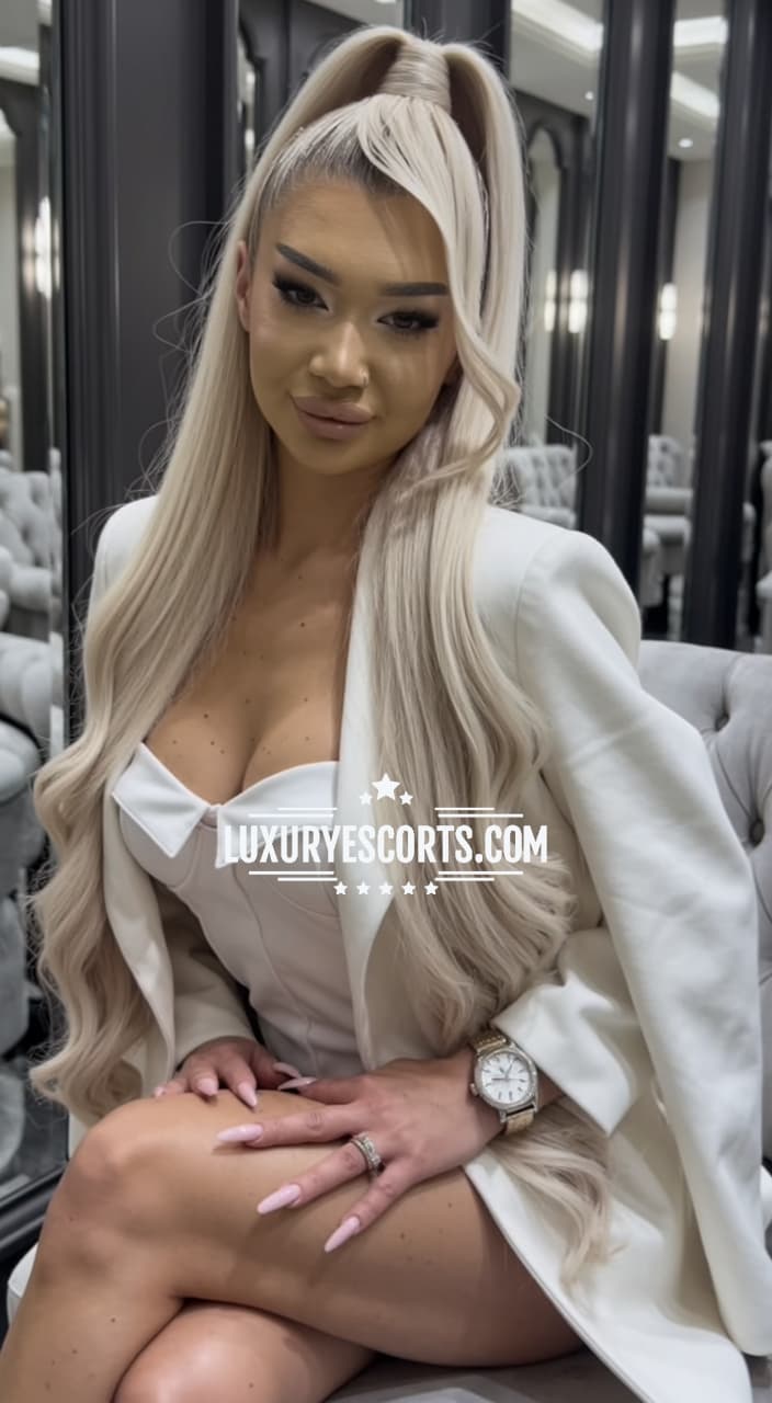 I invite you into a world of luxury and passion, with a graceful height of 167 cm (5'6") and a slender body that exudes charm. My large breasts, enhanced with implants, add a sensual note to my seductive appearance. My blond hair and brown eyes will captivate every gaze with their radiance.